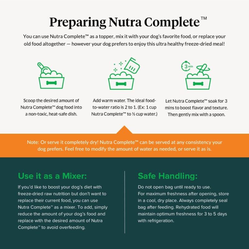 - USE AS FOOD OR AS MIXER – If you’d like to boost your dog’s diet with freeze-dried raw nutrition but don’t want to replace their current food, you can use Nutra Complete as a mixer. To add, simply reduce the amount of your dog’s food and replace with the desired amount of Nutra Complete to avoid overfeeding.