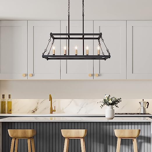 - Improve the Taste of Your Home: The stunning chandelier is made of metal in a black and gold painted finish, which blends well with modern, farmhouse and industrial styles. Adopted 5 gold candlesticks in the center of the geometric framework, this island light fixture ensures abundant light while creating a warm atmosphere and reviving a look in your dining room and kitchen island.