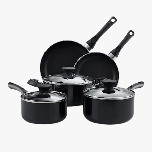 - 【Nonstick Cookware Set】:Our 8-piece nonstick cookware set includes: 1 quart and 2 quart saucepans with lid, 3 quart casserole with lid, 8 in and 10 in frying pan.