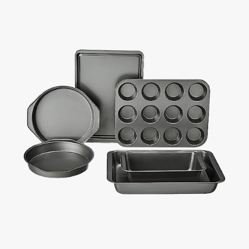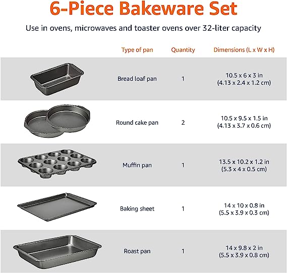 - 6-piece bakeware set includes a 9 x 5-inch loaf pan, 2 round 9-inch cake pans, a 12-cup muffin pan, a 13 x 9-inch roast pan, and a 13 x 9-inch baking sheet