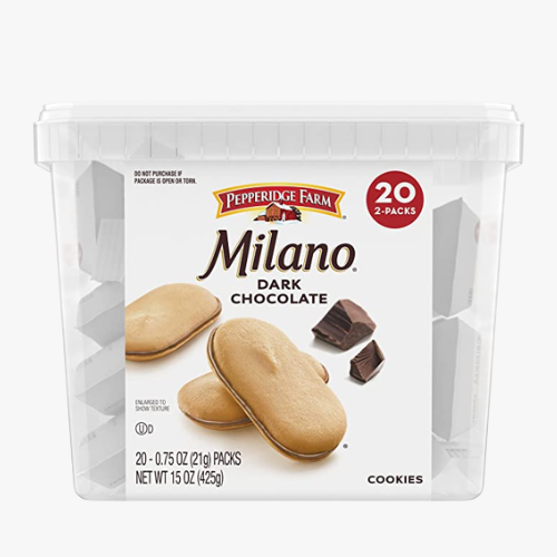 - Multipack includes: 20 0.75-oz. packs (two cookies per pack) of dark chocolate Milano cookies